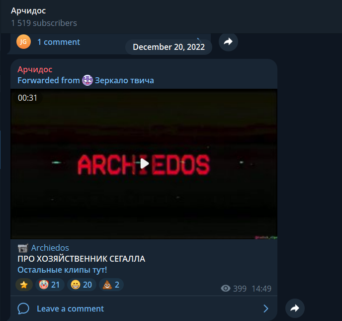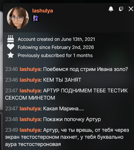 >>26397177 Если это так, тогда респект арчидосу. Только представьте, маленький ноунейм стример на 100 зрилов, одной сценкой на 10 секунд запустил форс, от которого ближайший подсос меда, крутой Саня Сегал трясется уже 3 года, и никак забыть не может. Арчи легенда в таком случае