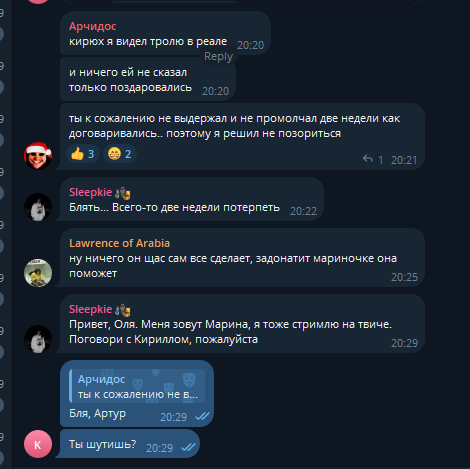 просто Марина за Артура любого порвёт, до последней выходки Сегала с угрозами ему и слов про его маму она изменила свою позицию, до этого все шутки про висяк удалялись из чата