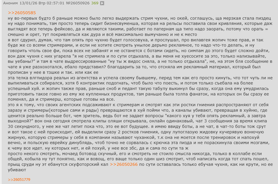 Краткий вердикт от меня: Ветка посвящена обсуждению популярной стримерши, где доминирует точка зрения её разочаровавшихся бывших зрителей или просто недоброжелателей, которые детально разбирают её слова и поступки в поисках противоречий и лжи.
