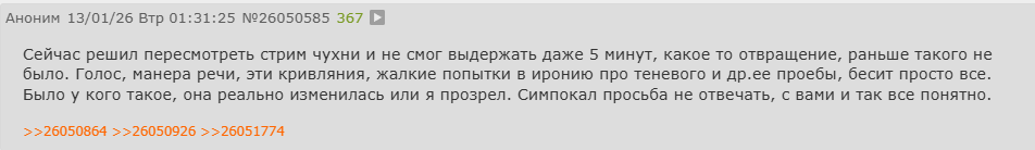 Общий настрой треда: Тред очень токсичный. Основная масса постов — это негатив и критика в адрес стримерши. Защитники либо пытаются рационально объяснить её поступки (лень, человеческий фактор, сложность стриминга), либо просто агрессивно реагируют на хейтеров, называя их "обиженными симплами" и "червями". В треде также присутствуют элементы мета-обсуждения самих участников, где они обвиняют друг друга в том, что они "симпы" или "хейтеры", а также обсуждают, влияют ли эти треды на карьеру стримерши.