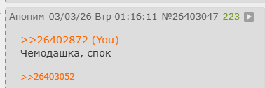 >>26404390 2 поста весь тред? ты как б провоцируешь на срач, прибегая сюда и просто писюкая КВАЛЬТИЛЯ КВАЛЬТИЛЯ ЗАВИДУЕТЕ вместо аргументов или чего-то на подобии Сколько тебе платят-то за ежедневное скатывание треда такими вот забегами и реплаями постов своими никому невсравшимися поисками протыков? Есть что по делу? Говори. Я вот вчера ваще 0 постов написал и когда пришел, то угарал с той хуйни, что вы обсуждали, про возможность посадки и в прошлом треде ахуительные твои аргументы с другим челом, где ты завайпал "ТЫСКОЗАЛ" пришлось в дашчане нажать скрыть ветку, вы там так нафлудили, что тред катнули, постов на 200 хуйнул этой хуетой Меня буквально неделю не было. Ушел в прошлом треде на 150-м посте и только вчера полистал эту хуету снова из-за стрима с лору в бане зашел почекать что тут у вас