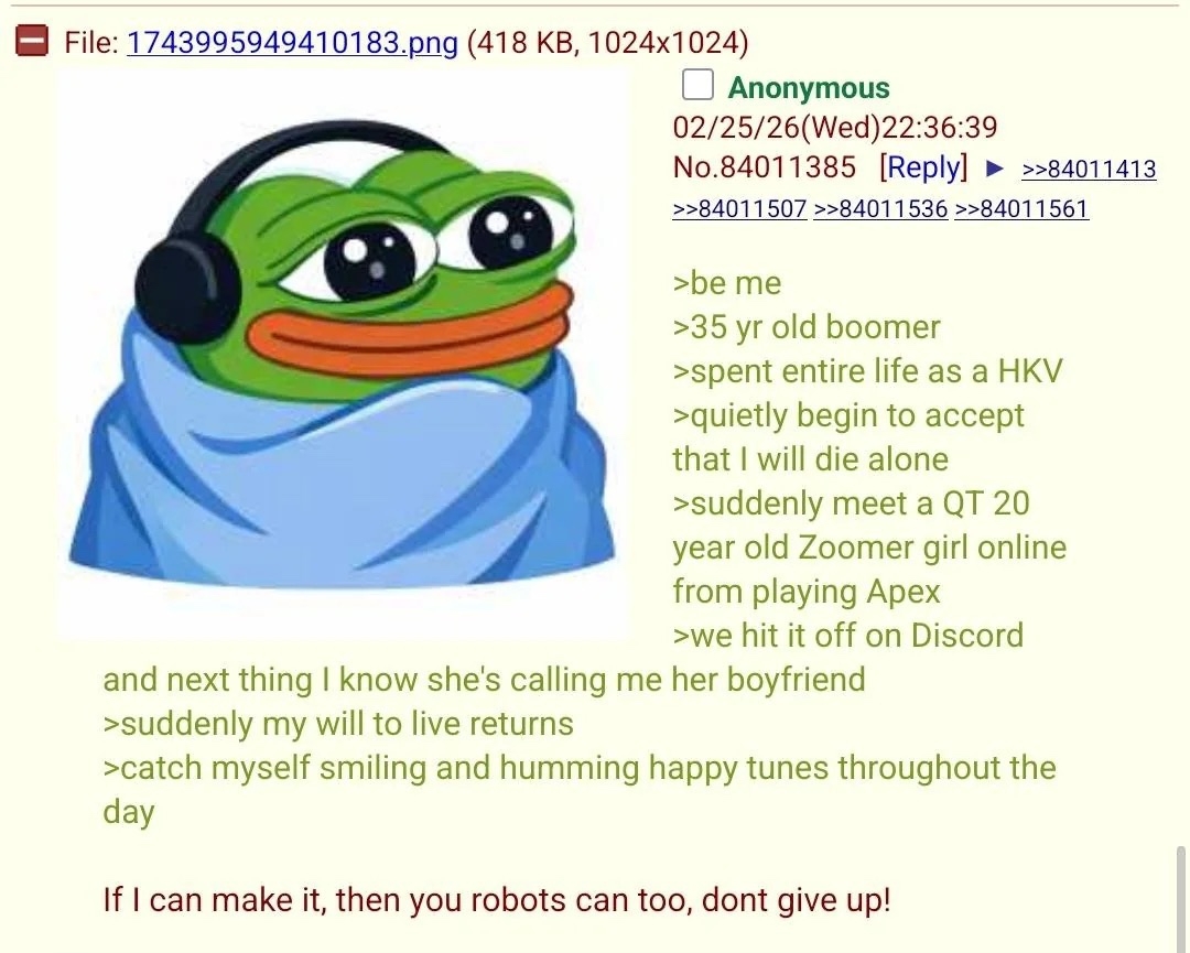 >>26402641 >Тут люди с ума сходят Абсолютно согласен, я гига-нормис работающий в офисе и имевший несколько отношений. Я уже буквально фразачками из треда в ИРЛ пользуюсь. Шутки про коляски, про перчики, про Аримифага и т.д. Люди слушают и непонимают, а я лулзу ловлю.