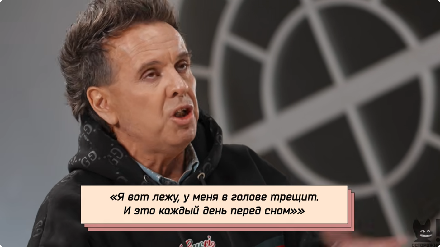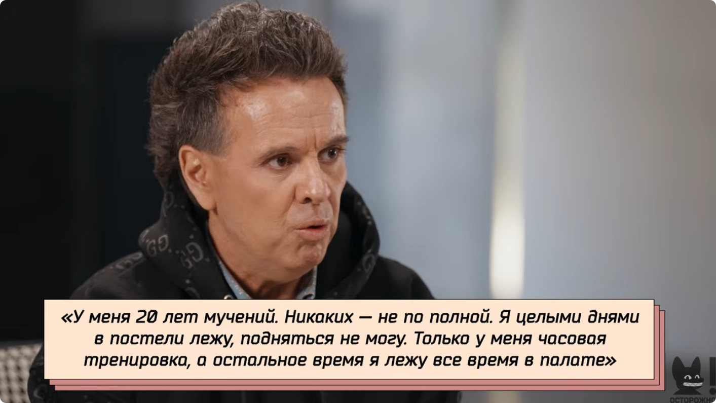 «Я целыми днями в постели лежу, подняться не могу. У меня есть часовая тренировка, остальное время я лежу. Я ужасно себя чувствую, это даже не обсуждается. Злопыхателей у меня хватает. На сцену не пойду. Я хромой, горбатый человек. Многие считают, что я еще герой: в таком состоянии с людьми общаюсь, а не послал всех», — подытожил исполнитель.