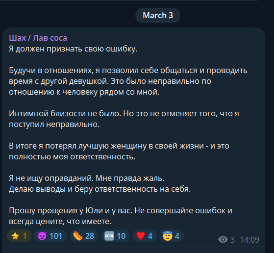 А вот во время общения с Наташкой вообще не искал и не говорил ничего такого. Странное совпадение, что как только он затильтовал из-за нее в Дубае сразу начал тёлку искать