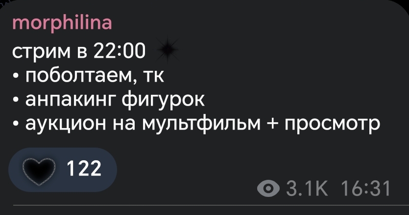 Очень хочу чтобы сегодня Вадимка зашел к Морфилине в самом начале, начал с ней заигрывать, позвал ее в дс, там они бы пиздели, она бы пошла делать аук, он бы закинул на какую нибудь милую историю и потом они вдвоем глянули бы этот мультик. Единственное он вебку не даст, это минус вайбик жесткий