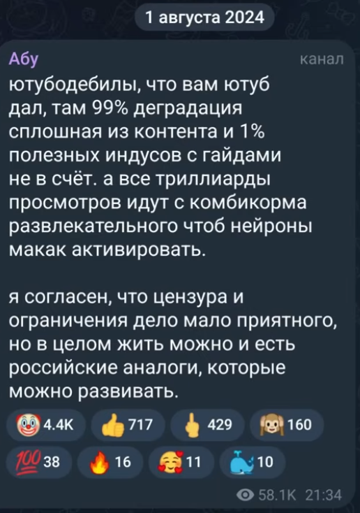 >>26417481 телегодебилы, что вам тг дал, там 99% деградация сплошная из контента и 1% полезных чатов с родственниками не в счет. а все триллиарды просмотров идут с комбикорма развлекательного чтоб нейроны макак активировать.