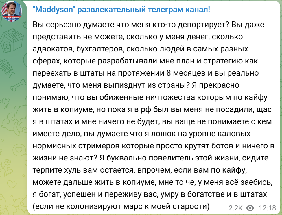 >>26419606 Скорее всего, он просто желает деньги по инерции. К тому же у него за столько лет потребности стали довольно высокими. То есть он не сможет как обычный америкашка жить на 4-5к долларов в месяц, ему нужен доход значительно выше, потому что он привык к определённому уровню жизни. Он почему в Америке именно дом искал, а не квартиру? Потому что он в рашке привык сидеть в своём апрелевском поместье, с хорошим ремонтом и доступности всякой хуйни.