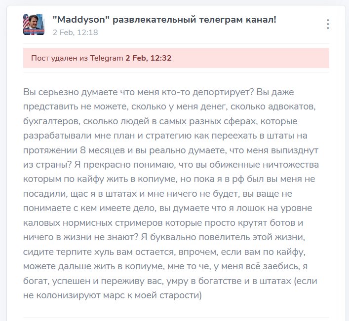 Тут обсуждали недавно, почему у Эвелона деп 200к, а у Чмодья 15к при относительно похожей аудитории по цифрам. Так вот. Роляет не только количество аудитории, но и ее качество. У Вадика аудитоия нормисы, у которых все норм с бабаками. А у Чмылюхи его чемоданы это нищие лузеры додики инцелы, который физически не способны нормально депнуть. Поэтому Жопич несмотря на свой гигаонлайны такой нищий относительно.