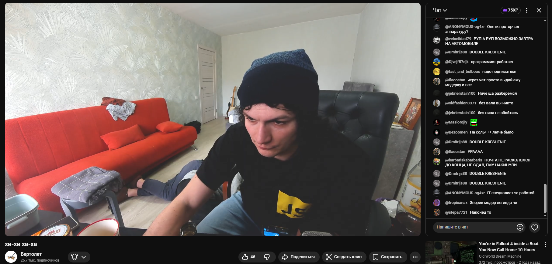 >>26421650 Накрутка тухлодырая, Солевой опустился до накрутки уже лол, чат пустой еле ползёт. Диван стримит с кроватью. Это те самые дебилы которые верят в 2к живых зрителей у Селюка.