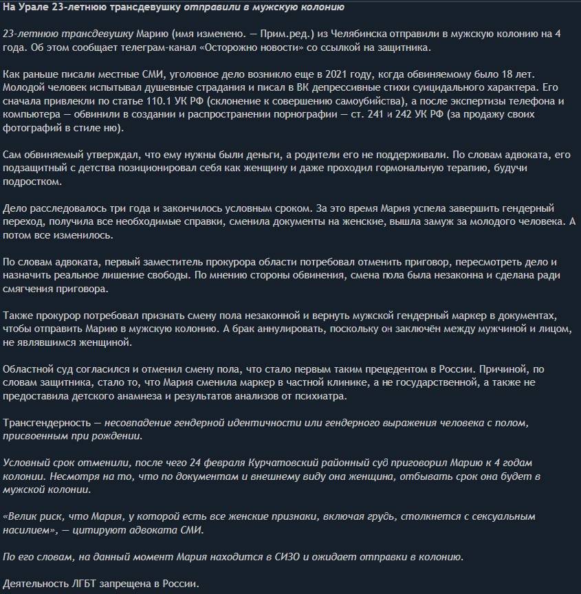 >>26441435 Быть транс персоной даже в рашке не запрещено. Женя нигде не рассказывает о своем переходе, не обсуждает лгбтк+ сообщество и тому подобное, поэтому к ней нет вопросов. Логически мысли, амне своей разъёбанной трансфобной тупой жопой.