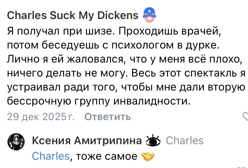Получать пенсию по шизе не собираюсь, потому что это тебя убивает, что тебя могут за любой чих закрыть в дурку навсегда. И еще боязно за лишение прав, хотя я боюсь не то что на машине ездить, а на велосипеде, и не понимаю, как люди не бояться ездить по дороге и сбить кого-то. Но мало ли, вдруг я захочу купить себе буханку и зарабатывать развозом досок в огороды. Хотя я и так прав лишен навсегда скорее всего, т.к. откосил по дурке, хоть там не лежал, а ходил 5 дней с утра всего.