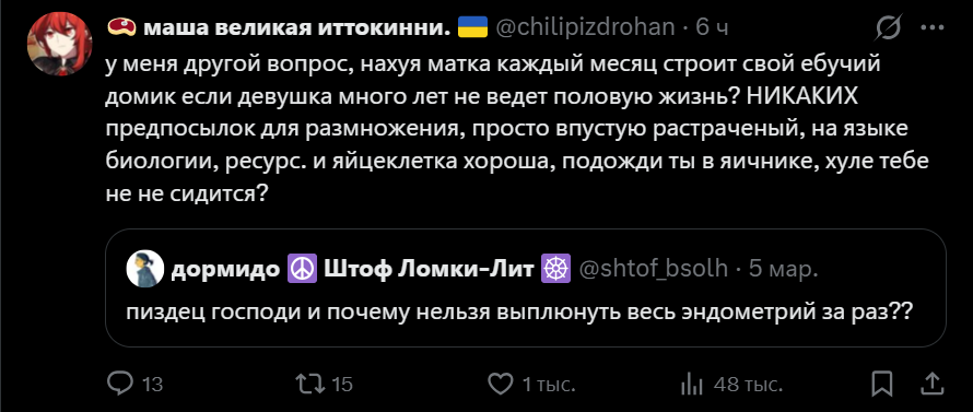 А еще меня поражает, как Пиздяна постоянно про свои месячные пишет. Про циклы, овуляцию, ПМС, кровь из пизды, боли и прочее. Она хочет всех и в себя в первую очередь убедить что еще климакс не начался и она фертильная? Бабе 40 лет, не 12. Уже пора давно привыкнуть ко всему. Вот пиздец будет когда климакс реально начнется. Там вообще перестройка гормональная будет организма с приливами, болями и шизой.