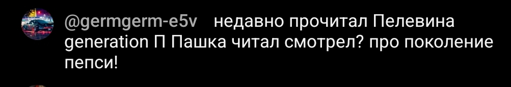 Паша кстати решиил прочитать эту книгу. Думал там будет про Пепси и про девяностые с харажами и кариками, а там хуйня про зикуураты и рекламу. В итоге дропнул читать и вернулся к написанию своей книги про настоящее поколение Пепси, а не пелевинскую наркоманию. Ждете Пашину книгу?