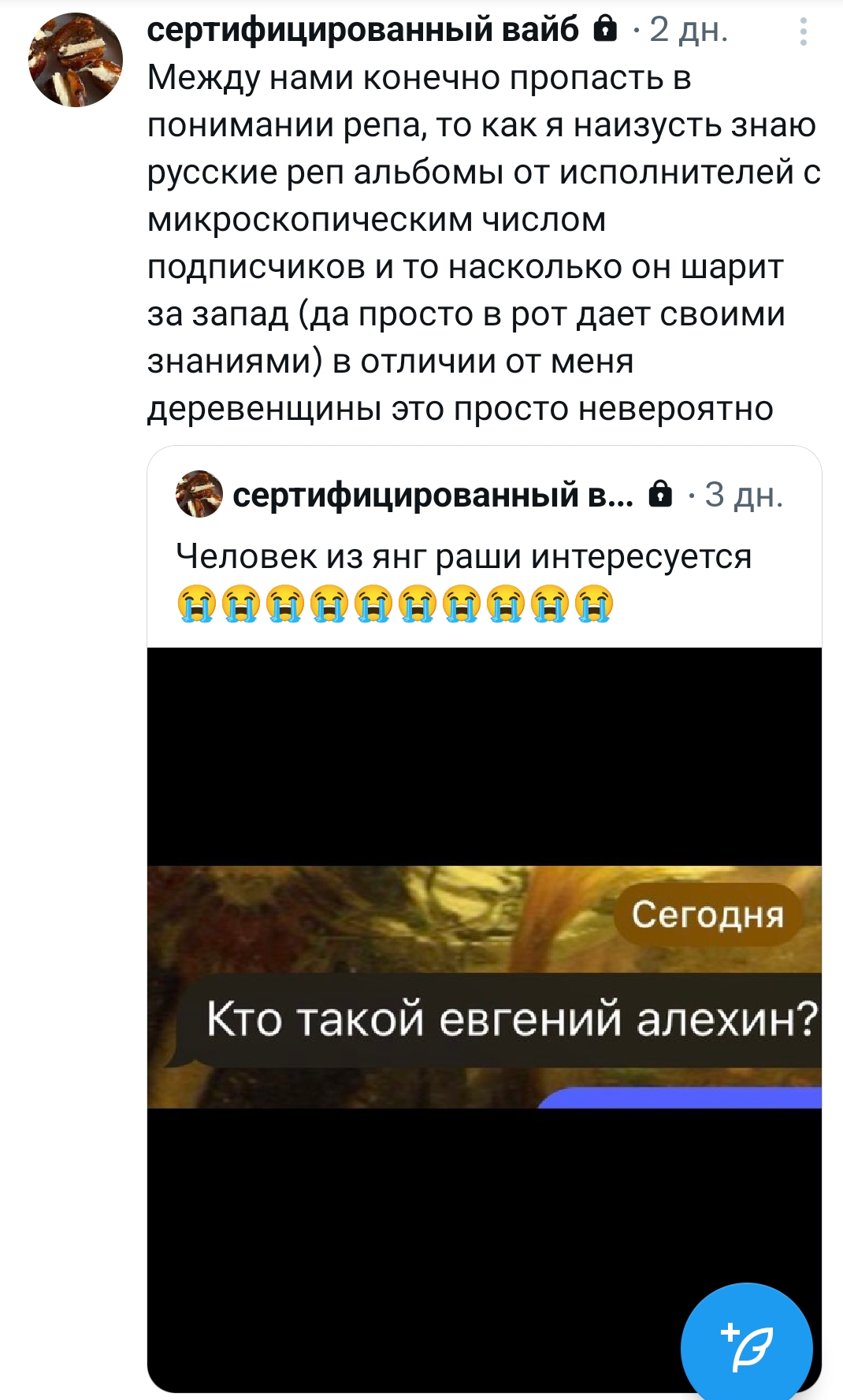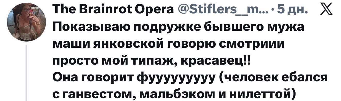Да не Мраз это сука, жопу ставлю. Она же сказала что он загадочный и мало фоток, а Мраз везде ебалом торгует, в сериале снимается и 2 подкаста с Пукером было со всей инфой про распад Янграши. Плюс не стал бы он изменять жене с хуйшей, он вообще не такой человек по публичному образу.