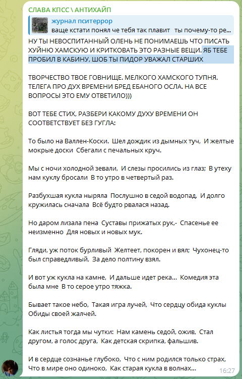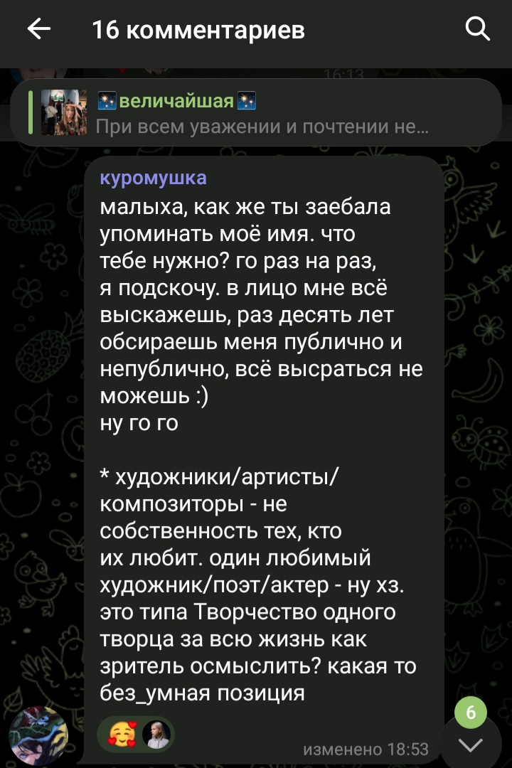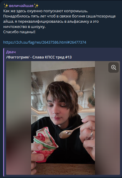 Кстати, тот акк, которого она за жопича выдавала, потом сюда выложил видос со всей перепиской, где она порнуху кидает, предлагает мелких фанаток в ряд уложить попами вверх и тд. Типа анон представился жопичем, а она типа поверила