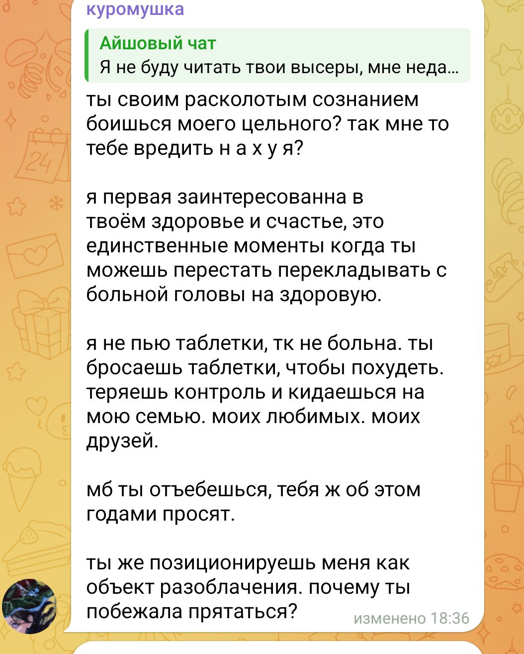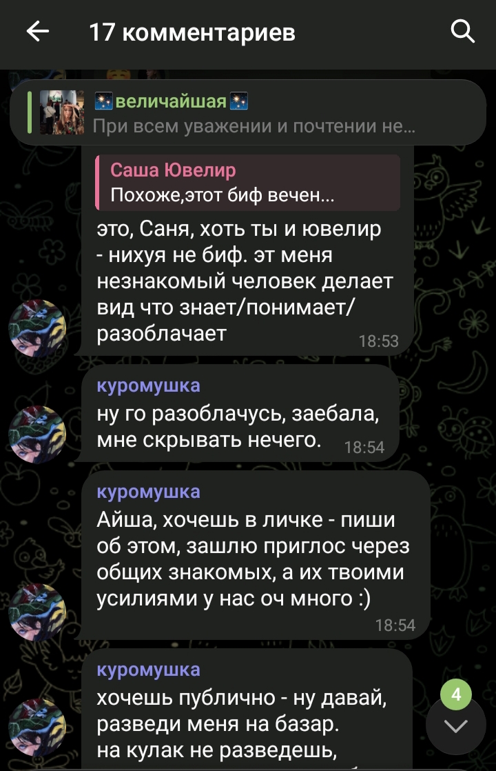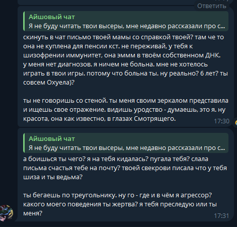 Мне объективно приятно то, что Айша "посмела упомянуть" куру, а та ей ничо не может сделать. Может это мои какие-то комплексы, но вот так. Особо приятно, что не может выставить Айшу сумасшедшей