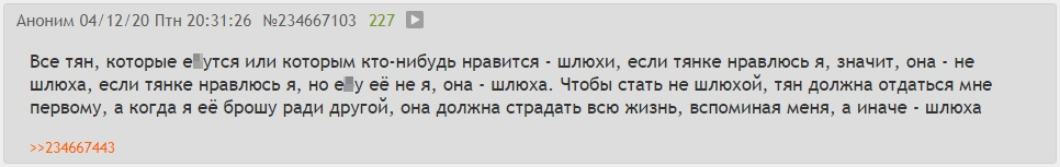 >>26456143 Напомни мне, Карина на лево и на право меняла парней, тусовки делала частые с алкоголем и вообще, да? Из всех местных ваших тут баб, Карина не была в этом замечена - это факт. Внешность тоже лучше или не хуже чем у многих тут баб - это тоже факт. Это если посмотреть местные разделы. О какой страшной бабе и проститутке ты сейчас пишешь мне не понять, а я же опять говорю, что всеми этими выдумками и преувеличениями ты просто пытаешься себя же успокоить, что Карина кривая и жирная, проститутка и шлюха. Если она опять станет тощая и закроет платформы с обычным эро контентом, то ты будешь опять орать какая Карина бревно кривое бесформенное и лентяйка без контента. А вот у других то есть, а у неё нет. Забавный ты и тебе подобные, но если это не так, то какая твоя цель тогда, зачем ты так трясёшься из-за какой-то для тебя неинтересной и страшной бабы, ты шизофреник что-ли? (@_@;)