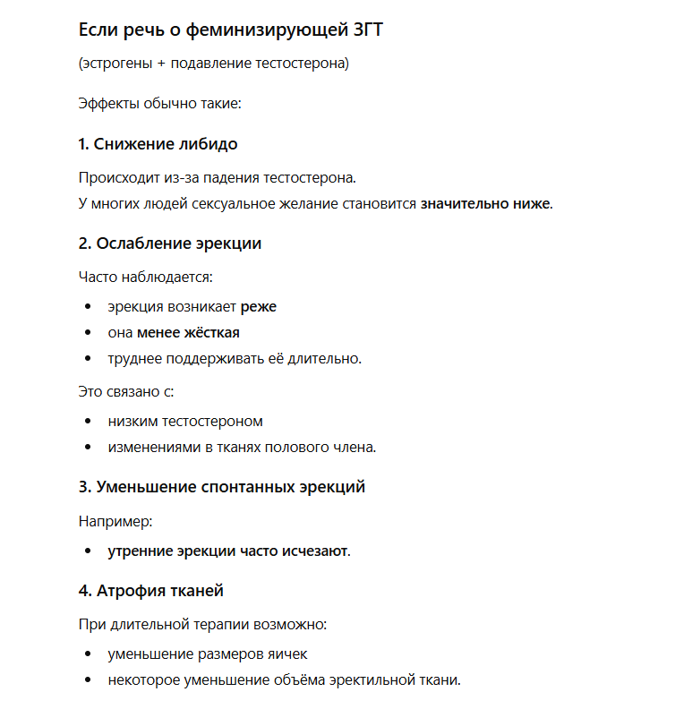 >>26460236 Погугли как влияет эстроген на мужской организм, в частности на эрекцию. Чем дольше идёт приём гормонов, тем сильнее проявляются последствия. Человек слишком сложный организм, чтобы поменять что-то одно и не поломать другое, поэтому даже у обычных таблеток есть список побочных эффектов. Что уж говорить про более кардинальные вмешательства в виде гормональной терапии.