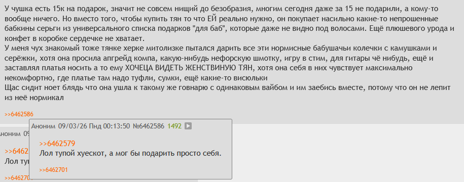 Ебало моё имаджинируйте, как молодёжь говорит. Вчера поехал к РСП-огру, купил тюльпаны, клубнику по оверпрайсу, пиццу и игрушку. Пока брал всё это, видел кучу красивых тяночек, которые висли на своих чедиках, получив одну розочку, радовались простому знаку внимания. Слышал, как один сказал, что у него денег нет во "вкусе очка" посидеть, а тяноке похуй, хихикает и висит на нём. И тут я, которому не то что ОГР секс не дала, а даже не поцеловала и вообще на контакт не шла, никакой нежности и объятий. Приняла моё подношение как само собой разумеющееся. Дитё нервы помотало. Уехал я на такси посреди ночи, чувствуя себя дураком. Лучше бы дома остался и подрочил, просидев дома все выходные.