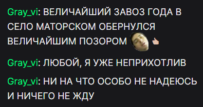 gray_vi: ДУМАЮ ЛИЗА СПЕЦИАЛЬНО В САУНУ ЗАМАНИЛА ВАС ЧТОБ ТЕБЯ СПОИТЬ И НА ЭТОМ ЗАВОЗИТЬ gray_vi: ЖАЛЬ ТЕПЕРЬ СУХОЙ ЗАКОН И ТАКИХ ЗАВОЗОВ НЕ БУДЕТ gray_vi: ты каждый алко стрим на "позоре" завозишь SUBprise но разве может клоун или шут опозориться по настоящему если это шоу ?