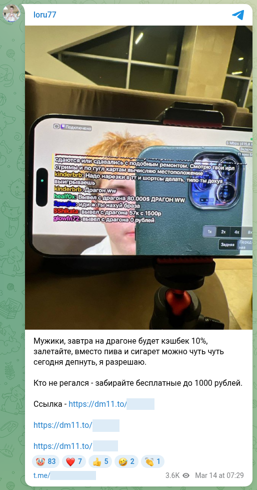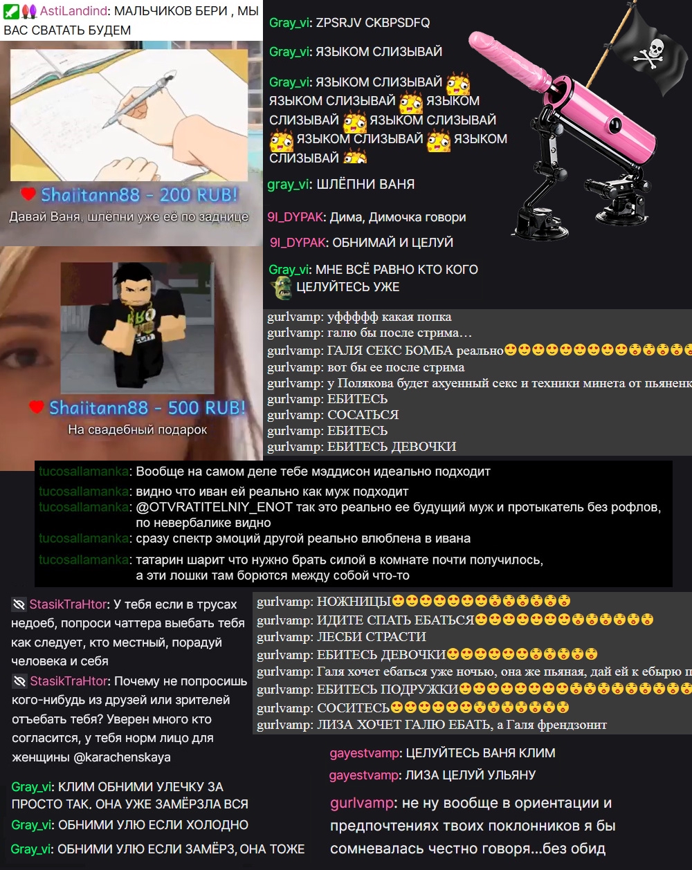 Введу в курс дела: Накрутил харкачке ботов, в тгк на твиче, кидайте страйки тупорылой свинине, подсос Гали должен страдать как и её симподауны, спамил со всех акков, пока газик не перебанил, как Влад гей, вот лички пидарасов, одного симподауна разьебал, теперь харкачка его терпеть не может, в первый раз с Климом не смог, зато сейчас отыгрался