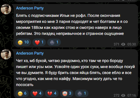 >да мы его затравили, да он полгода стримить не будет, да он в петельку полезет Илья сегодня на стриме >Всем привет, сходка прошла отлично, ребята добрые и позитивные, одного петуха прогнали ну от него мусоркой воняло, но это пох, стримы будут каждый день как в 2018 марафон по ведьмаку и стар варс