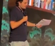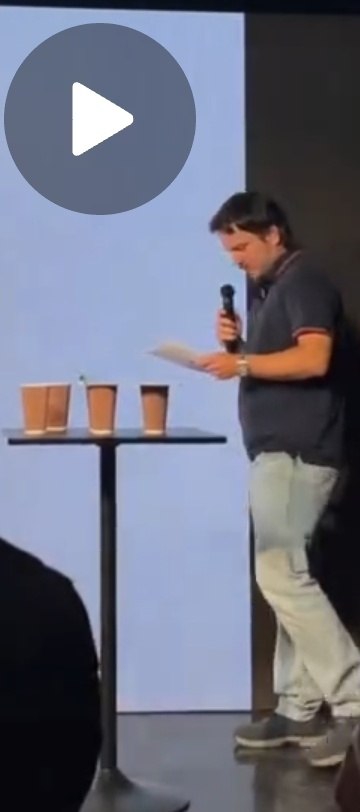 Любопытно еще, что аудитория то, совсем не там, куда он смотрит. Он смотрит в листочек и в пол. И как будто в своем манямирке. Психологи, разберите. Мне кажется это последствия общения с монитором и собутильниками. Он боялся этой аудитории, просто на уровне психологии, потому что это живое выступление.