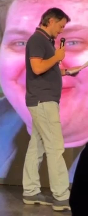1. Походка. Выкидывает носок при ходьбе, как будто у него галоши на 3 размера больше, походка напоминает младенца, складывается ощущение что человек в пынеходах или просто додик, которые не умеет ходить в 40 лет; 2. Обувь. Какие-то китайские кроссовки с каблуками лол, как будто он в спортмастере тарился 3. Какие-то штаны аля додик 70-ые, он че, танцор диско? Хули у него мотня свисает на кроссовки? 4. Длинная поло, которая укорачивает ноги и делает силуэт несуразным, при этом обтягивает в области пуза и плеч, из-за чего он выглядит как додик. 5. Прическа "Жмиль", какой-то ком говна на бошке, который делает огромную голову еще больше.