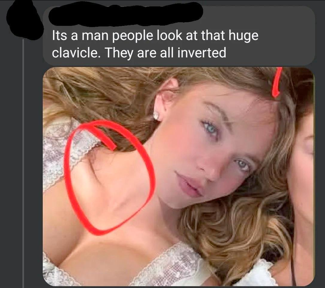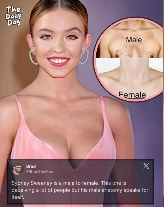 В сети хайпит тема, что Сидни Суини изначально была парнем. В соцсетях уже несколько месяцев ведут целое расследование, пытаясь найти доказательства её транс-перехода. Главные аргументы сторонников этой теории — слишком широкая шея и прямые ключицы актрисы.
