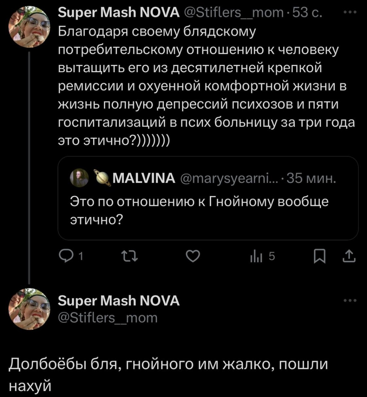 Пожалуй, пришло время покинуть тред. Нравилось заходить к вам и обсуждать Жопича, Оксижопича и Димку Памперса. Люблю ваши мемы и канал Михи Терпа. Но, к сожалению, мне больше некомфортно находиться здесь. Как-то стало тут много негатива с приходом групи Славы и ее подписчиц. Здесь теперь все заражено ее психической неуравновешенностью, очень жаль, что ее матери на нее плевать и она позволяет ей так позориться. Всем позитивным анонам спасибо за контент и приятное времяпровождение в былые времена. 🫶
