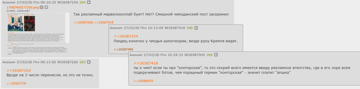 1. Главная тема — скандал вокруг выходного Стримерша перенесла выходной с пятницы на понедельник, сославшись на плохое самочувствие (месячные). Тред разделился: «Симпы» защищают её, считают, что она заслужила отдых, ждут «лютого контента» с рекламной интеграцией Marvel. «Хейтеры/шизы» называют это манипуляцией и пиздежом. Вспоминают прошлый раз, когда она «отравилась рыбой», чтобы не работать, но оставила рекламный стрим. Считают, что она просто сливает стрим, чтобы отдохнуть перед платником.