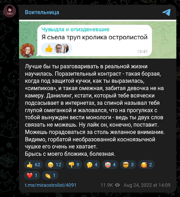 Вот сколько сижу в этом треде, убеждаюсь насколько зависть страшное чувство. Дарью объективно одну из самых красивых женщин с модельным типажом срет вот это чучело. Даже как то не верится откуда у таких персонажей право высказываться в интернете есть. У женщины очевидные проблемы с головой
