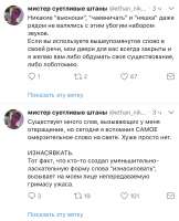 Есть такое слово - «жалкий». Так вот, Итонь, по словам которого он успешен/популярен/интересен/живет и трахается в ЛА, тратит силы, нервы и время, чтобы рассказать малолетним читателям в твиттере, звучание каких русских слов ему не нравится. Жалкий. Бесперспективный. Истекающий желчью и варящийся в собственном говне заинеимение более интересных вариантов, чтобы провести время.