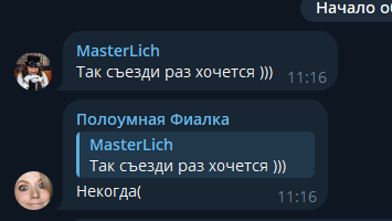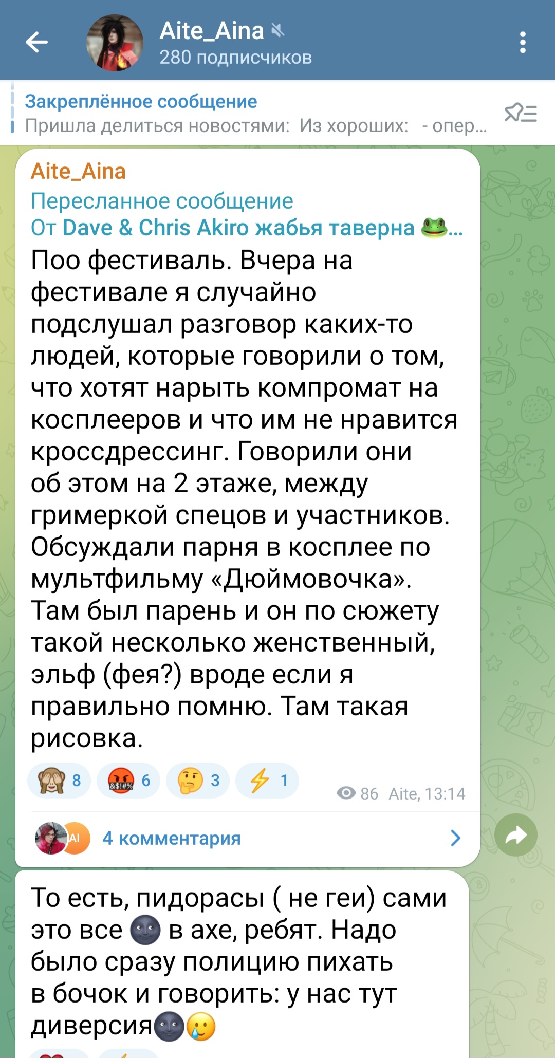 >>1771470 После её поста про сф и овс с ней вообще не хочется иметь дело. Обижена так и причины понимать не хочет. Что-то косплеерши Совенок-фест привирают относительно дружбы с фестунами. Агрифано вон как бомбила из-за того, что её никто не замечал на последнем сф. Ну не верю я что фестун бы её в свою компанию не приняли. Бомбила ведь от того, что орги не замечают. На простых посетителей феста, коим она и сама была, да ещё и за свои, срать ей хотелось.