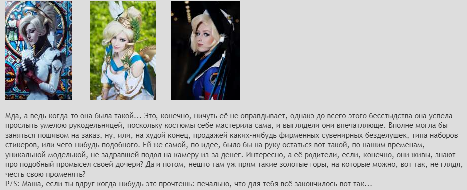 Спасибо анончик за просвещение. Вроде как слежу за темой, но об этой мадам впервые слышу. Погуглил навскидку и если я правильно понял по фоткам, то она завязала с косплеем и теперь штампует обычную эротику ?