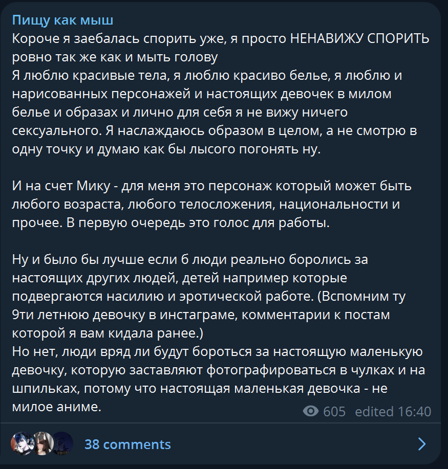 Ну и было бы лучше если б люди реально боролись за настоящих других людей, детей например которые подвергаются насилию и эротической работе. (Вспомним ту 9ти летнюю девочку в инстаграме, комментарии к постам которой я вам кидала ранее.) Но нет, люди вряд ли будут бороться за настоящую маленькую девочку, которую заставляют фотографироваться в чулках и на шпильках, потому что настоящая маленькая девочка - не милое аниме.