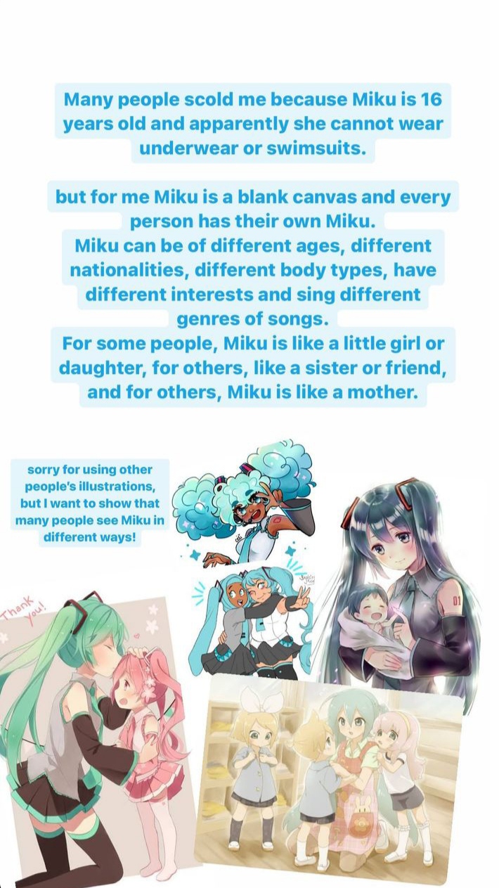 И на счет Мику - для меня это персонаж который может быть любого возраста, любого телосложения, национальности и прочее. В первую очередь это голос для работы.