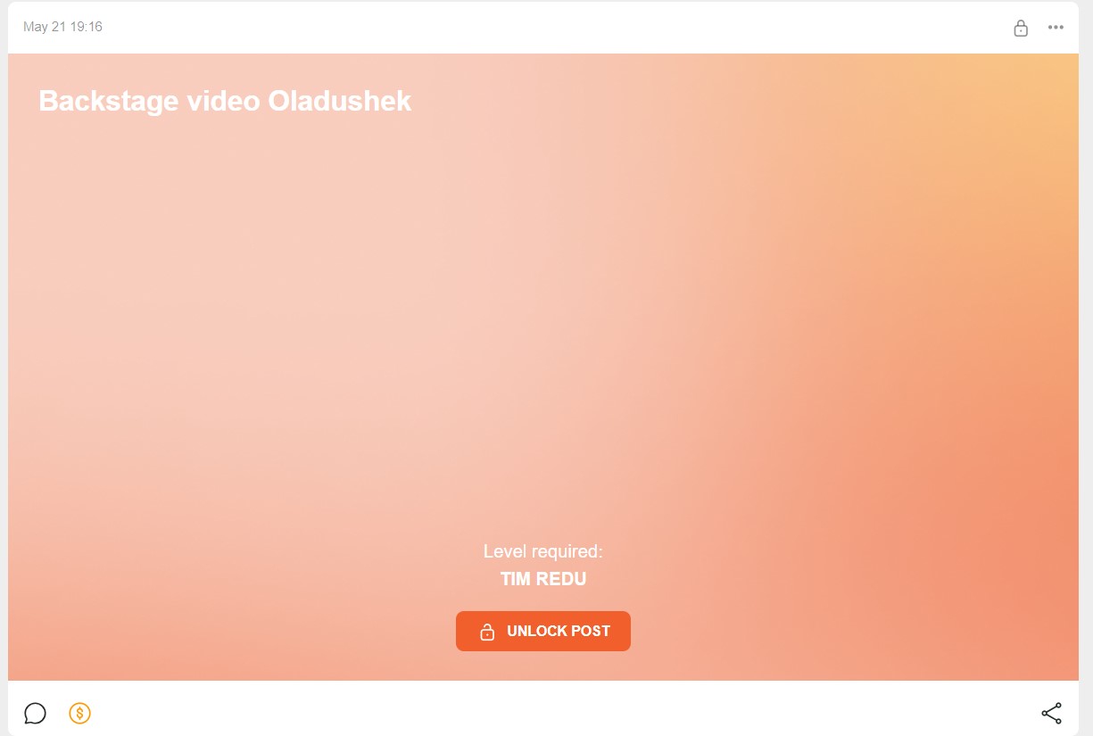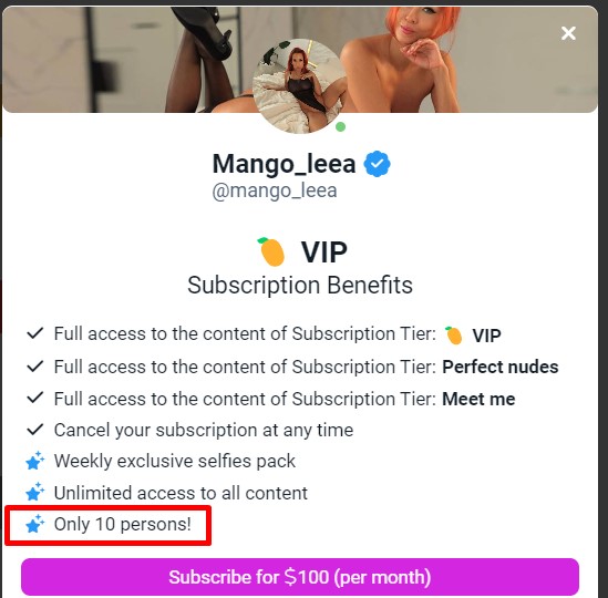 Лол, она там на Фансли ещё один тир добавила с бэками за 25 баксов. При этом он не включает тир за двадцатку. И кстати только сейчас догадался почитать описание тиров. Оказывается, что за двадцатку она должна каждую неделю выкладывать видосы длиной не меньше 3 минут. Видимо, в реальности видос 3 минуты каждую неделю это один видос на 4 минуты и три видоса менее 30 секунд.
