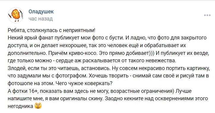 Уже почти 4 года Оладушек подогревает интерес к себе заявлениями о том, что кто-то когда-то слышал от неё, что она якобы не прочь сняться в порно'. Если вы настолько безнадежны, чтобы в это поверить, добро пожаловать в наш удручающе упоротый тредик. У нас уже есть два-три её неизлечимых симпа и один фотограф, который из-за неё собственной смекал очки разрушил себе карьеру. 'В её представлении это фотосесии с уровнем откровенности "журнал "Караван историй".