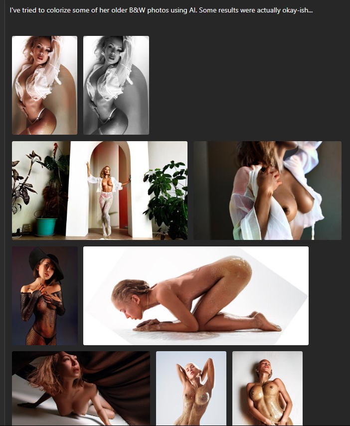 >>1773897 Так она взбугуртила из-за того, что фотки просто раскрасили с помощь ИИ? Я-то надеялся думал, что там с каких-то снимков одежду убрали или вообще в порно вставили. Если это ещё и бусти фотографа, то вообще причина тряски непонятна.