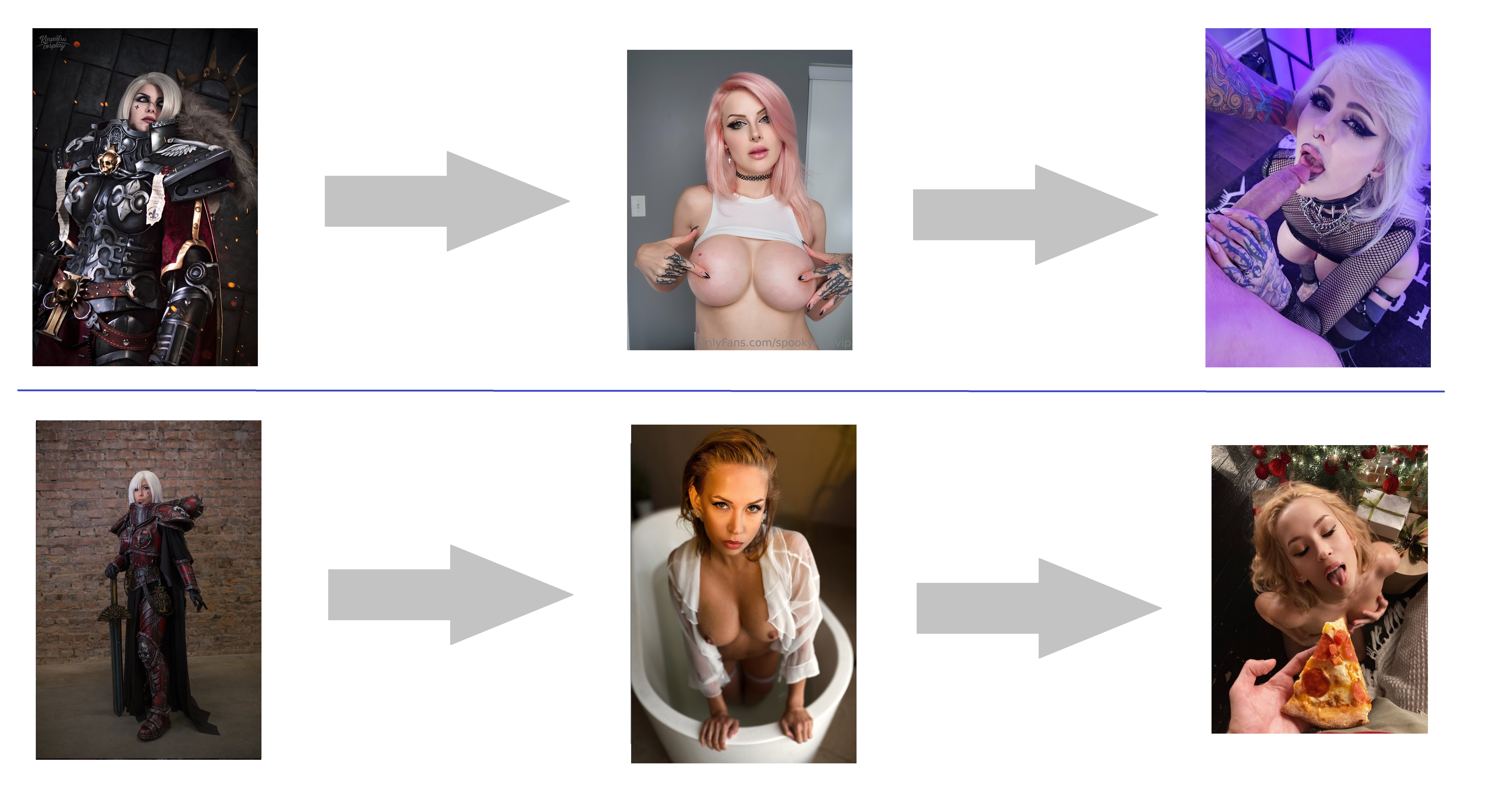 Честно говоря, большая часть моделей занимаются именно тем, что ищут баланс -- показывать как можно меньше, тратить на съемки как можно меньше и продавать как можно дороже. (Те, что уже набрали пару-тройку сотен тысяч подписят в соцсетях, обычно начинают скамить сразу.) Но Оладушек и тут по-своему уникальна, потому что она вроде как привлекает косплеем, а на Бусти у неё эрокосплей раз в год, буквально. Сегодняшние Skittles меня доконали, конечно. Все фотографы, с которыми она более-менее постоянно работает -- это какая-то кунсткамера. Не зря лучшие сеты у неё от Тима и Семенякова, с которыми она только по разу пересеклась.