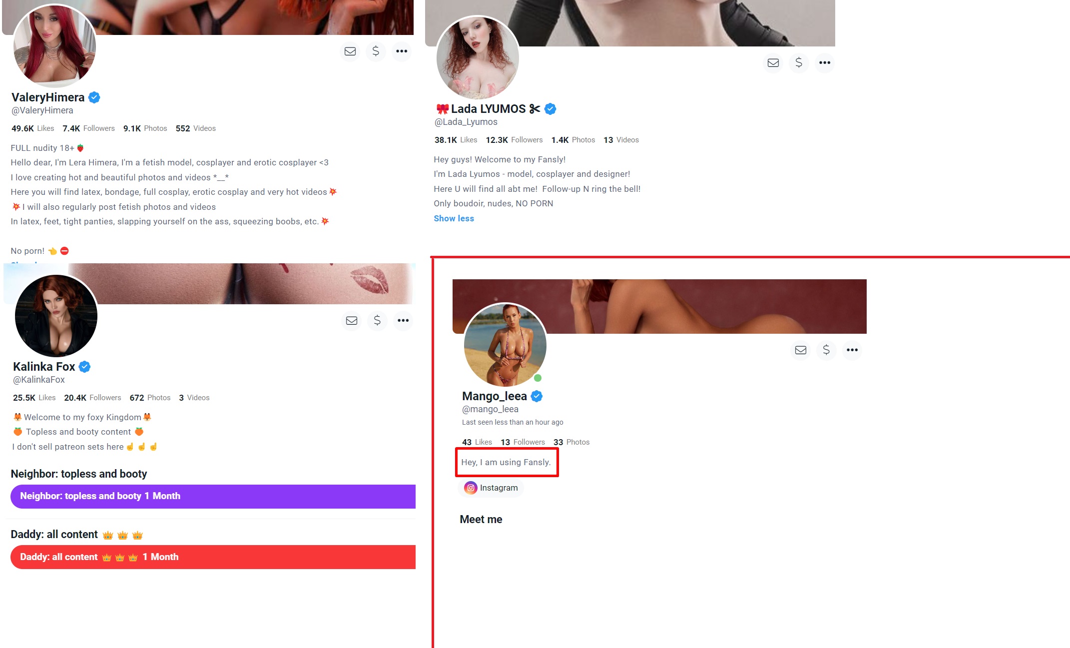 >>1783927 Для начала ей нужно хотя бы объединить свои имена и честно написать в своем ВК, что она теперь эромодель. После создать зеркало Фансли на Бусти, куда сразу перенесет большое число подписчиков. Таким образом у нее будут покупать контент и там, и там и она хоть какие-то бабки сможет зарабатывать. Очевидно, что ей нужно раскручиваться среди ру-аудитории, потому что в англоязычном интернете она никому не нужна и ее никто там не знает. А раскручиваться через известные сайты она почему-то не хочет, иначе на фотодрома она бы тоже называлась Mango Lia.