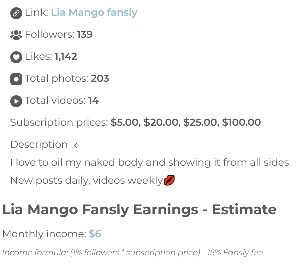 >>1783817 Там внизу формула написана в явном виде. Если считать в обратную сторону, то заработок до вычета доли фанслая = 6/0.85 = 7$. Один процент от её подписюнов = 1,4. 1,4*5 (минимальная цена подписки) = 7, все сходится. Короче, формула такая средняя, что среднее некуда. Лучше бы по лайкам считали, они хоть как-то показывают вовлечённость.