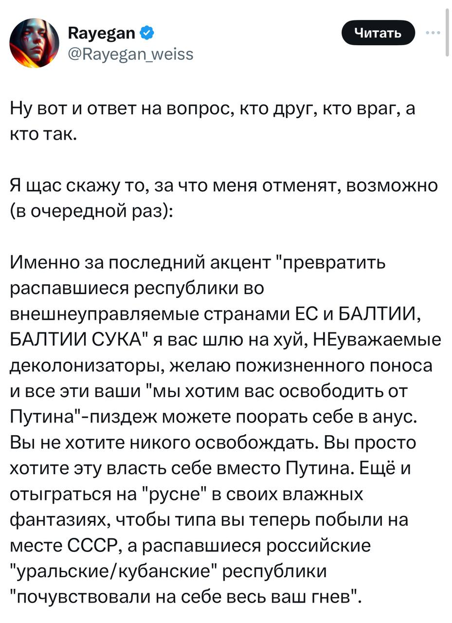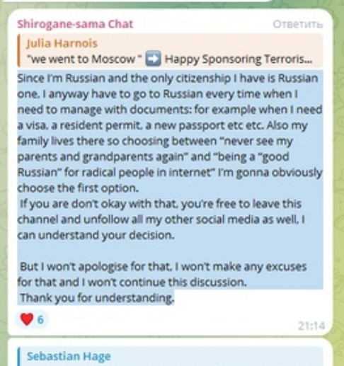 >>1781083 >>1781083 Поскольку я русский и единственное гражданство, которое у меня есть, - российское, мне все равно приходится обращаться к русскому каждый раз, когда мне нужно разобраться с документами: например, когда мне нужна виза, вид на жительство, новый паспорт и т.д. и т.п. Кроме того, там живет моя семья, так что, выбирая между “никогда больше не увидеть своих родителей, бабушек и дедушек” и “быть “хорошим русским” для радикально настроенных людей в Интернете”, я, очевидно, выберу первый вариант. Если вас это не устраивает, вы можете покинуть этот канал и не подписываться на другие мои социальные сети, я могу понять ваше решение.