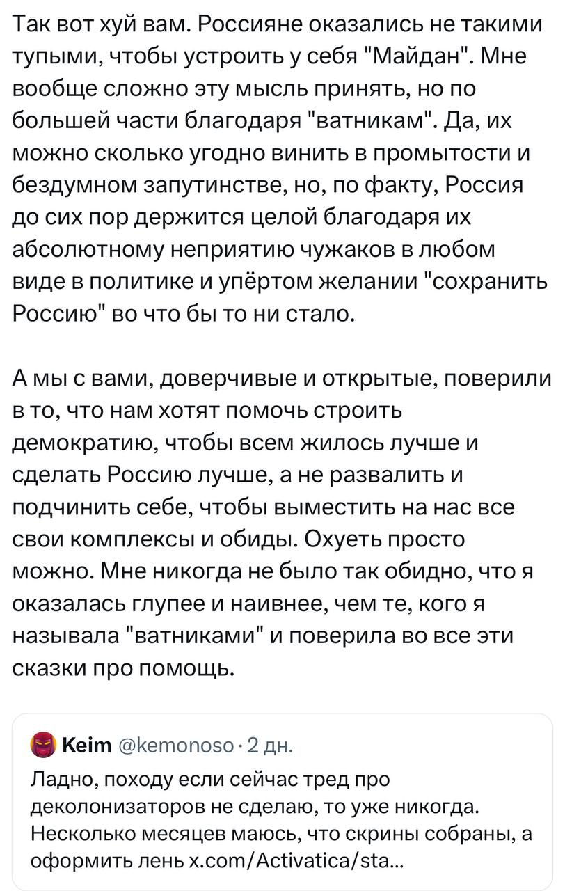 >>1781311 >>1781313 Махорошая, спокойнее. Я понимаю что у тебя нет аргументов кроме криков про промытие и фронт, но попробуй задать сама себе вопрос - а вот эта точка зрения это точно твое мнение или тебе его навязали в твиттере?