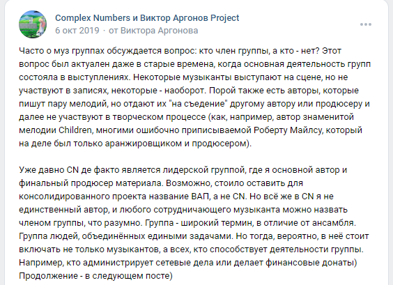 Уже давно CN де факто является лидерской группой, где я основной автор и финальный продюсер материала. Возможно, стоило оставить для консолидированного проекта название ВАП, а не CN. Но всё же в CN я не единственный автор, и любого сотрудничающего музыканта можно назвать членом группы, что разумно. Группа - широкий термин, в отличие от ансамбля. Группа людей, объединённых едиными задачами. Но тогда, вероятно, в неё стоит включать не только музыкантов, а всех, кто способствует деятельности группы. Например, кто администрирует сетевые дела или делает финансовые донаты) Продолжение - в следующем посте)