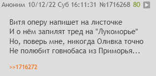 Говно роняю с пердежом на паркет Никто не любит мой тупейший еблет Живу без секса, втихомолку дрочу Но стану мачо, коль Оливку включу!