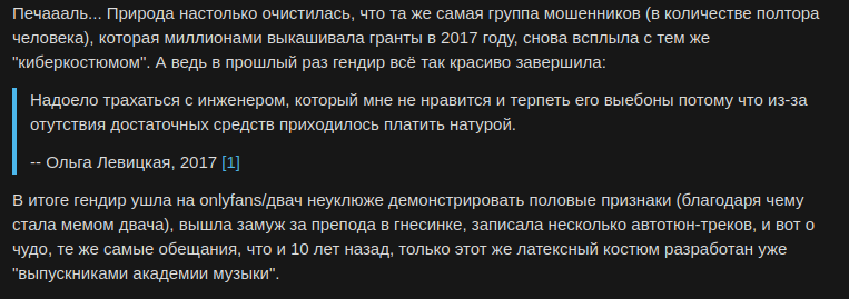 Сколько всего понаписали, пока я не заходил! Странно, что в таком количестве текста всё равно ничего не говорится о ключевых вопросах темы: почему не растёт Хирш, почему растут рога у МаксаFuckтора, зачем Кибереблонике аккредитация и патенты, если кибермуйня якобы уже приносит доход, почему так опозорился Говнобас и нахуя ему всратый Сарумяшка в его "Говняных Комплексах"? Наверное, реально скрипт пишет.