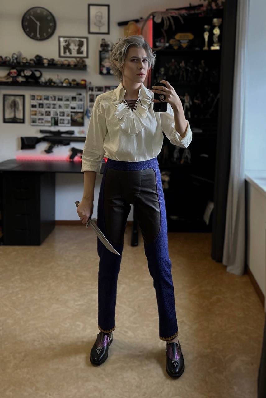 Я видела на мероприятиях ее, даже не десятки, а сотни раз. У многих уровень первого костюма, который не очень, у других он же (с картинки), покупной (даже у тех, кто при деньгах). Второй костюм реже встречается, но находят его. Пошив любой был хуже. У второго проблема в ремнях, но если их заменить, то за 5-8к вам такое платье и накидку делать никто не будет, и это не считая материалов.