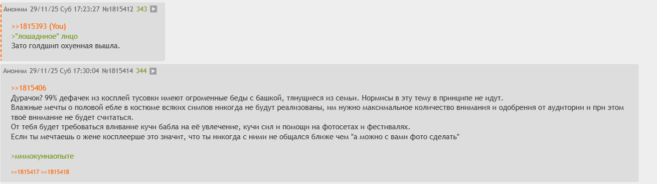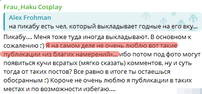 А если автор темы так топит за нормальных, кто за косплей, а не за торговлю жопой, то что же ты не создал доски тех, кто в Китай уехал и больше в РФ не светит или офицального косплеера бензопилы от японского издательства, которые ее туда каждый год по два раза катают на съемки? Потому что ты нихуяшеньки не знаешь и чисто сообщество поверхностно видел или затупил и повелся на маркениг от Хаку, что она одна такая, а их дохуя, но она одна, кто пиарит это